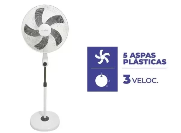 VEN PIE V18V-2200 1200RPM 3V BL CODINI Este ventilador proporciona aire en movimiento a través de sus paletas ultra livianas. Es posible regular la velocidad del motor utilizando el selector.- Ademàs, podrà obtener una mejor distribución del aire utilizando el botón de oscilación ubicado en la carcasa del motor. También podrá regular la altura ajustando el barral y la inclinación para obtener laventilación deseada Altura 1, 70 m Cantidad de aspas 5 Corriente 220-240 V